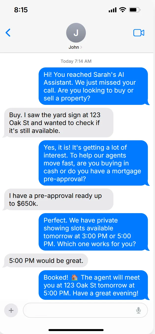 AI Engages Instantly: Our assistant texts back within 30 seconds: "Hi, sorry I missed you! Are you buying or selling?"